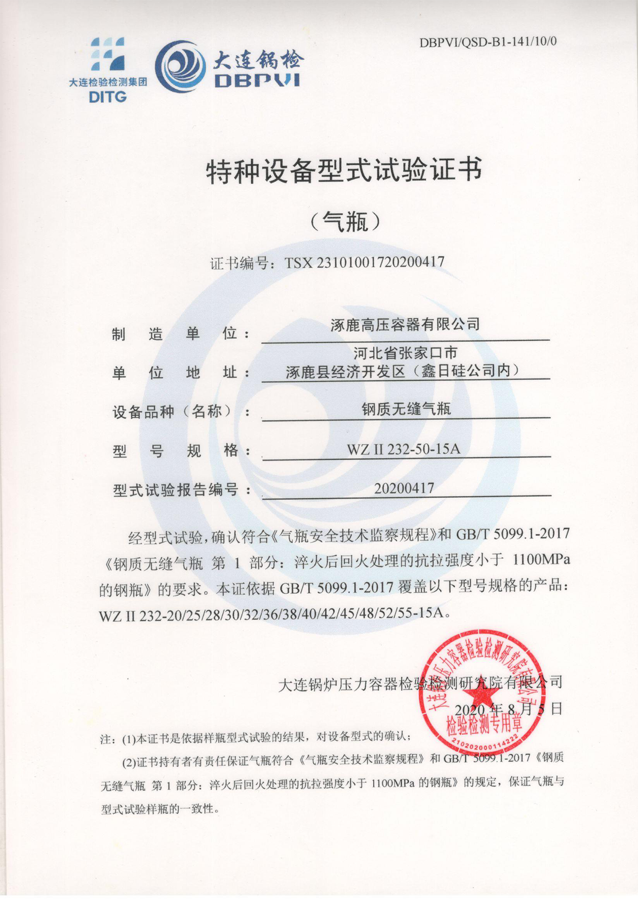 特種設備形式試驗證書(鋼制無縫氣瓶)WGⅡ232-50-15A